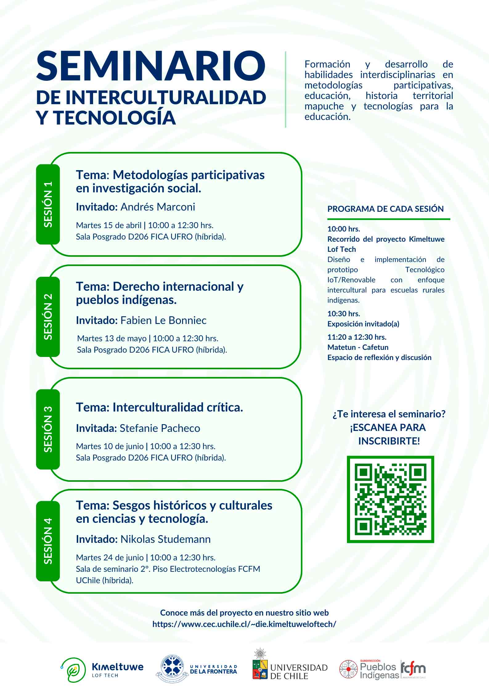 Desde el proyecto Concurso Idea 2024 ID24I10010 "Diseño e implementación de prototipo Tecnológico IoT/Renovable con enfoque intercultural para escuelas rurales indígenas", nos complace invitarles a participar en el Seminario sobre Interculturalidad y Tecnología.